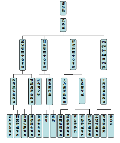 公司按照現代企業管理模式,建立了科學高效的組織機構,現設“一辦一部四中心”,分別為總經辦、綜合部、工程管理中心、人力資源管理中心、經營管理中心、財務管理中心。